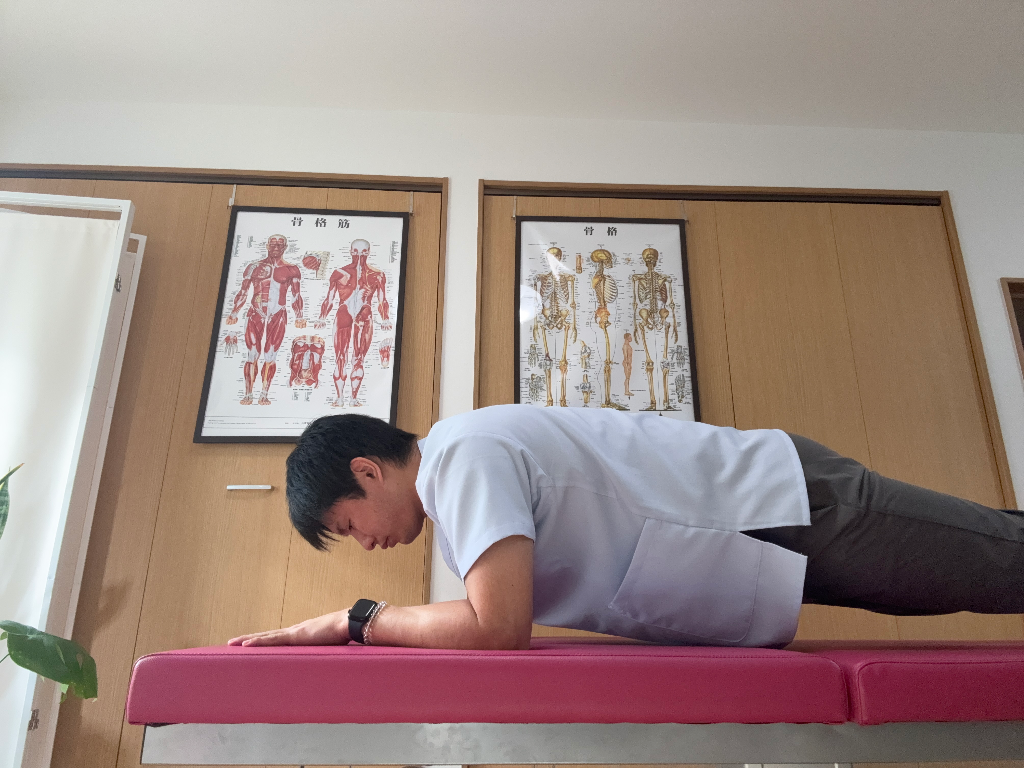 画像4枚目はうつぶせからお尻を持ち上げたプランクという体幹のトレーニングです。こちらも併せて行うと背骨が歪みにくく腰痛予防にもなります。