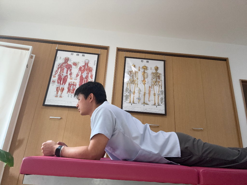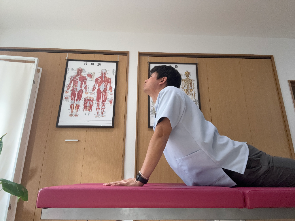 腰が丸く(腰椎が後方へずれる)なったり猫背の予防にも画像のようなマッケンジー体操をおすすめしています。